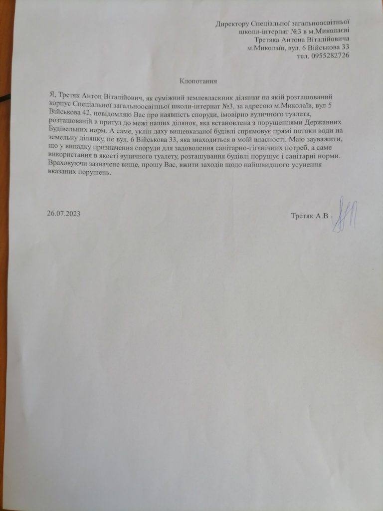 Як нам вдалось з’ясувати, чоловік не місцевий. Переїхав до Миколаєва нещодавно. Працівників закладу запевнив, що він тепер є власником будинку, який межує зі спальним корпусом навчального закладу. За його словами, після дощу вода тече у його подвір’я де він збирається поставити мангал.