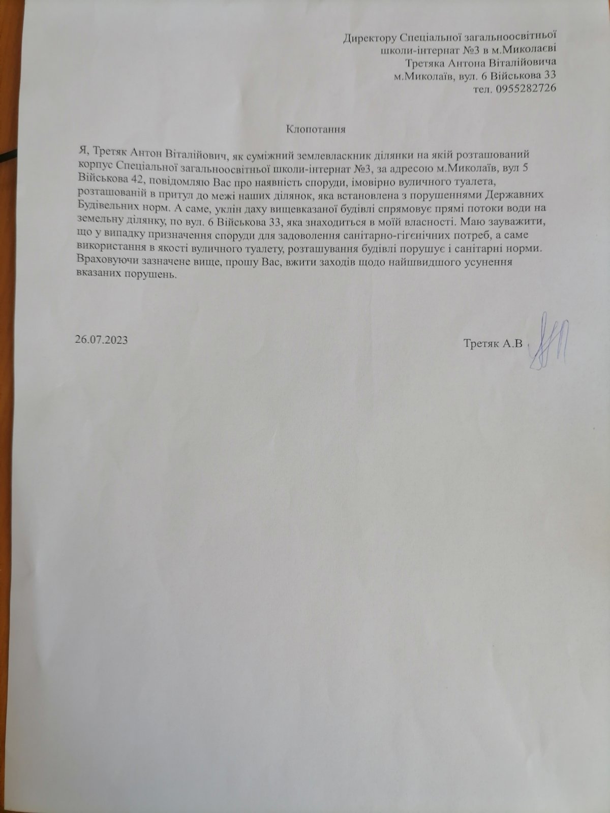 Власник будинку, який розташований біля Миколаївської спеціальної школи №3 Миколаївської обласної ради, дорікає скаргами, бо після дощу вода с будівлі закладу потрапляє у його подвір’я, де він збирається поставити мангал.